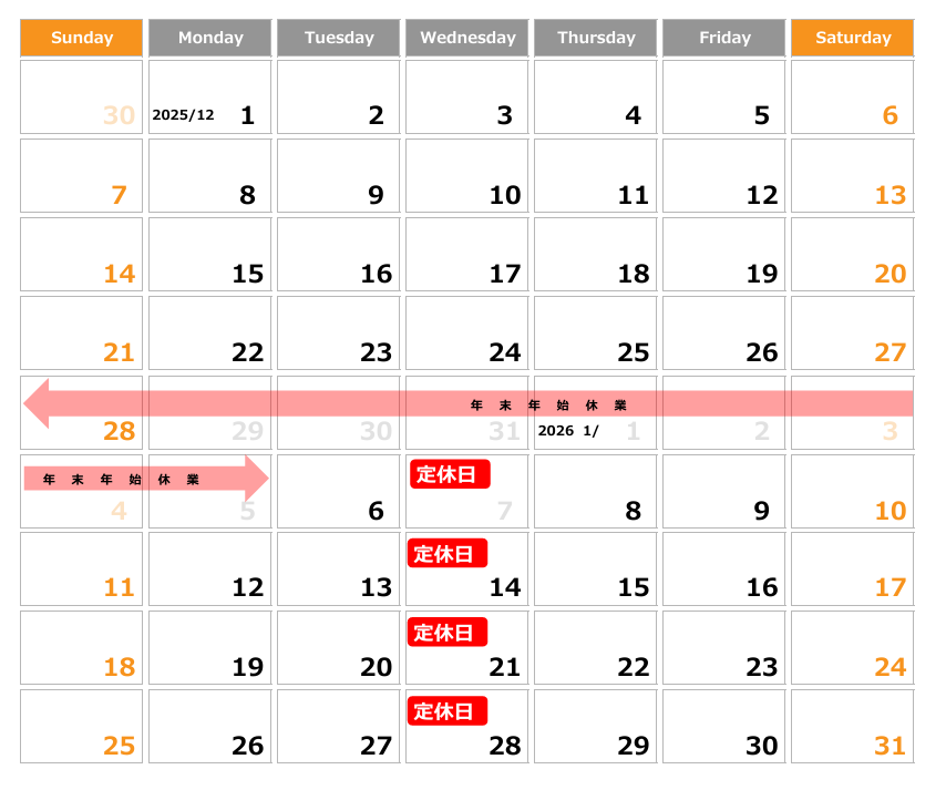 年末年始休業のお知らせ